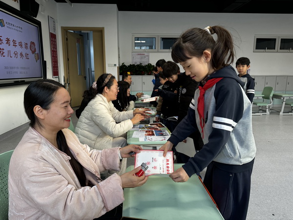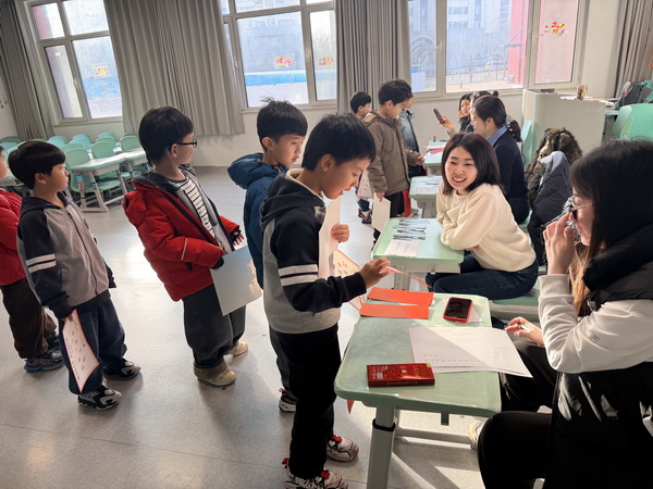 英语学科以“乐享英语·欢度春节”为主题,共安排了3项活动:在“我给家人来拜年”活动,学生抽取家人卡片,用句型 "Happy Chinese New Year......!"向抽到的家庭成员拜年,将英语知识与过年习俗相融合;在“新年盲盒我来拆” 活动,学生通过句型 It's my......来描述自己在盲盒里抽到的文具,在真实情境中运用了重点单词和句型;在“英文歌曲送祝福” 活动中,学生任选一首这个学期学过的英文歌曲进行演唱,在歌声中巩固了核心语言。一年级英语乐评通过卡片、歌曲等多元载体,激发学生兴趣,兼顾趣味性与实践性,提升了学生英语口语表达能力与学习自信心。