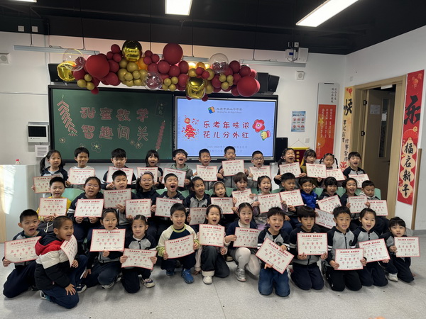数学学科将学科趣味与新年氛围巧妙相融,以三个智趣闯关活动为主线,让期末乐评洋溢着年味与乐趣。在 “口算糖葫芦” 环节,孩子们在一分钟计时里进行口算,颗颗 “糖葫芦” 串起的是扎实的运算功底;“图形红包雨” 中,孩子们从红火的情景图里辨识长方体、正方体、球体、圆柱体,用清晰的判断解锁 “红包”的不同形状,在观察与分类里玩转空间认知;“拨珠年货站” 里,孩子们数年货、说数的组成、拨计数器珠子,把数的概念与新年备货的热闹场景相联结,让抽象知识变得鲜活且亲切。数学乐评,孩子们在闯关中比拼智慧,在游戏里夯实知识,这既是对数学素养的趣味检验,更是一场浸润着年味的思维启蒙,为孩子们的新年添上了一抹甜蜜的数学底色。