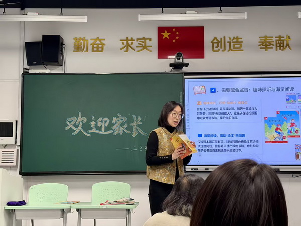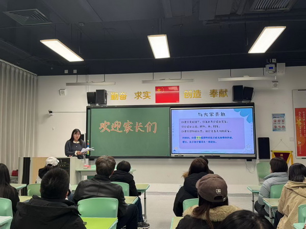 英语周老师和王老师,结合上学期各班的英语学习情况和本学期的教学目标,向家长们分享英语学习建议。充分肯定同学们在学习习惯和课堂参与度方面取得的进步,细致讲解了一年级下学期的学习内容与重点,推荐了经典绘本,鼓励孩子们养成良好的课外阅读习惯并开拓视野。