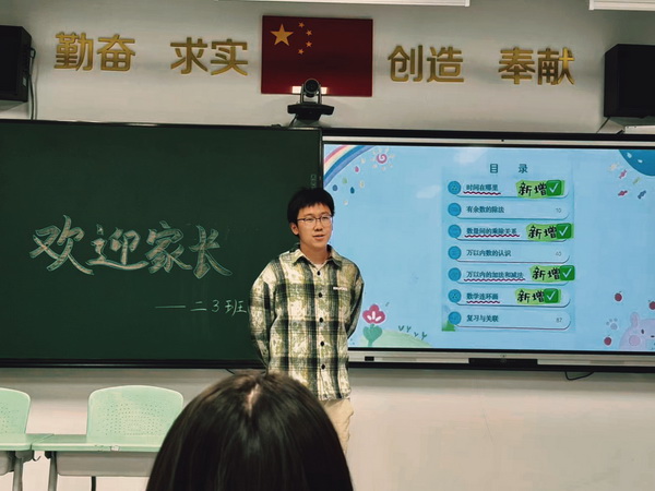 数学董老师和贾老师,围绕本学期数学学习展开深度交流。老师详细介绍了认识平面图形、100 以内数的运算、认识人民币等八大教学模块,明确各模块学习重难点。同时提出新学期培养孩子自主记作业、提高口算速度、规范书写、认真审题、强化解题思路、加强数学阅读等六大学习习惯。此外,还给出每日口算练习、生活中渗透数学知识、用好“思汇窗”开展数学实践活动等日常学习方法。