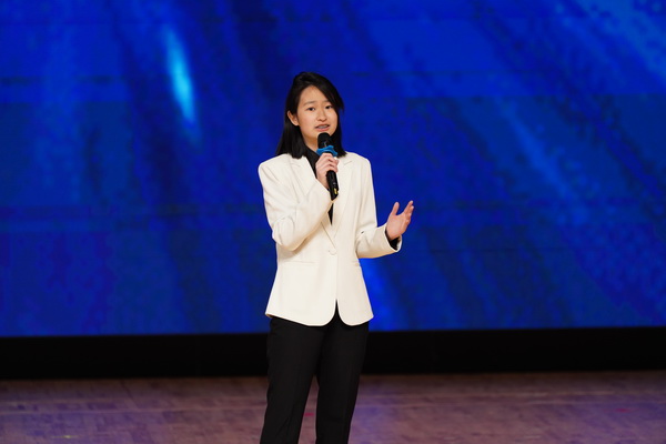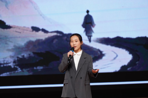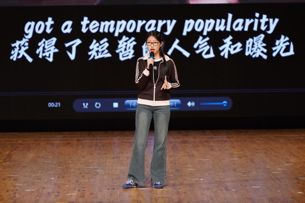 贯通3班艾桐同学用流利的英语演讲拆解经典电影的密码。她从镜头语言、人文关怀再到捕捉时代脉搏,探讨艺术与时代的共生关系。她引导同学们在光影中读懂经典的意义,明白经典并非偶然,而是创作者在暗室里反复打磨的赤诚,是困境中向光而行的执着,为艺术实践注入深度思考。启示同学们要专注于坚守,打磨属于自己的人生“经典”。
