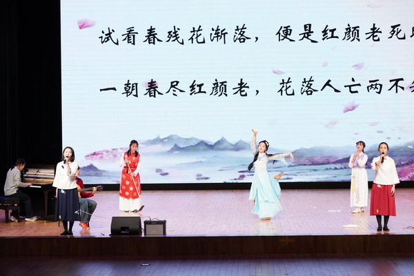 高一2班、4班玥瑶、悠然、艺宁、锦雯、嘉悦、妍希等几位同学带来的原创歌舞《葬花吟》改编自《红楼梦》,重现了黛玉葬花的经典场景。“花谢花飞飞满天”的低吟是林黛玉对生命的叹息,也是对美的脆弱与失去的重量的叹息。在落花与黄土的意象里,教会学子感恩相遇、在感伤中生出前行勇气。它让古典文学与青春姿态相遇,展现八十学子对传统文化的创新演绎。