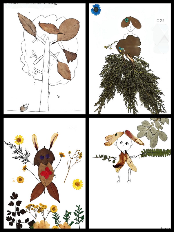 在“叶子的奇妙物语”创作园中,形状各异的叶子,为孩子们打开了一扇扇“想象之门”。学生们收集不同叶形,通过拼贴、添画等方式进行艺术创想,让植物华丽转身。一片银杏叶变成了蝴蝶的翅膀,几片细长的柳叶化成了小鱼的尾巴。从自然形态到艺术创作的转化中,孩子们体会到了创造的奇妙乐趣,科学观察与艺术表达在此交汇,理性思维与感性想象共生共长。
