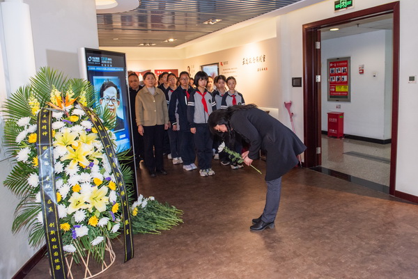 王选纪念陈列室三层展厅入口处,大屏幕上循环播放着王选院士生前不同时期的珍贵影像,他目光深邃而温和,仿佛仍在注视着后辈学子的成长。在庄重肃穆的氛围中,师生们列队肃立,依次上前,向王选院士的照片深深鞠躬并敬献鲜花。一束束白菊与黄菊,寄托着八十中学子对这位科学巨匠的崇高敬意与深切缅怀。献花过程中,展厅内鸦雀无声,唯有敬意在空气中流淌。