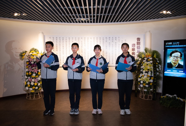 献花仪式后,学生代表深情朗诵了原创诗歌《因为有了他》。他们通过铿锵有力、饱含深情的诗句,回顾了王选院士以科技之力推动汉字印刷革新、筑牢文化自信的伟大功绩,赞颂他坚持不懈、开拓创新、无私奉献的崇高品格。朗诵声回荡在陈列室中,每一位在场师生都深受触动。诗朗诵将对王选院士的缅怀与敬仰推向高潮。