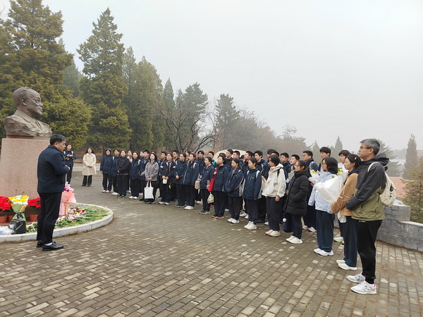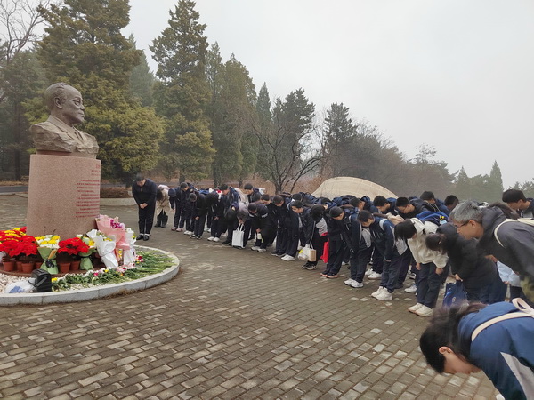 在王绶琯院士的雕像前,全体师生列队肃立,神情庄重。首先国家天文台韩金林研究员向同学们介绍了王绶琯院士的生平事迹:他不仅是中国射电天文学的开创者,更是郭守敬望远镜项目的重要奠基人;晚年王绶琯院士将大量精力投入到青少年科技人才培养中,他常说科学需要一代代人接力。他联合多位院士专家,共同发起成立了北京青少年科技俱乐部,开创了“大手拉小手”的科学教育传承模式。王院士一生“与星空对话,为祖国争光”的赤子情怀与卓越贡献,深深打动了在场的每一位师生。三名学生代表手捧鲜花,缓步走到雕像前献上花束,随后全体师生三鞠躬,向这位伟大的天文学家和教育家致以最深切的哀思与崇高敬意。